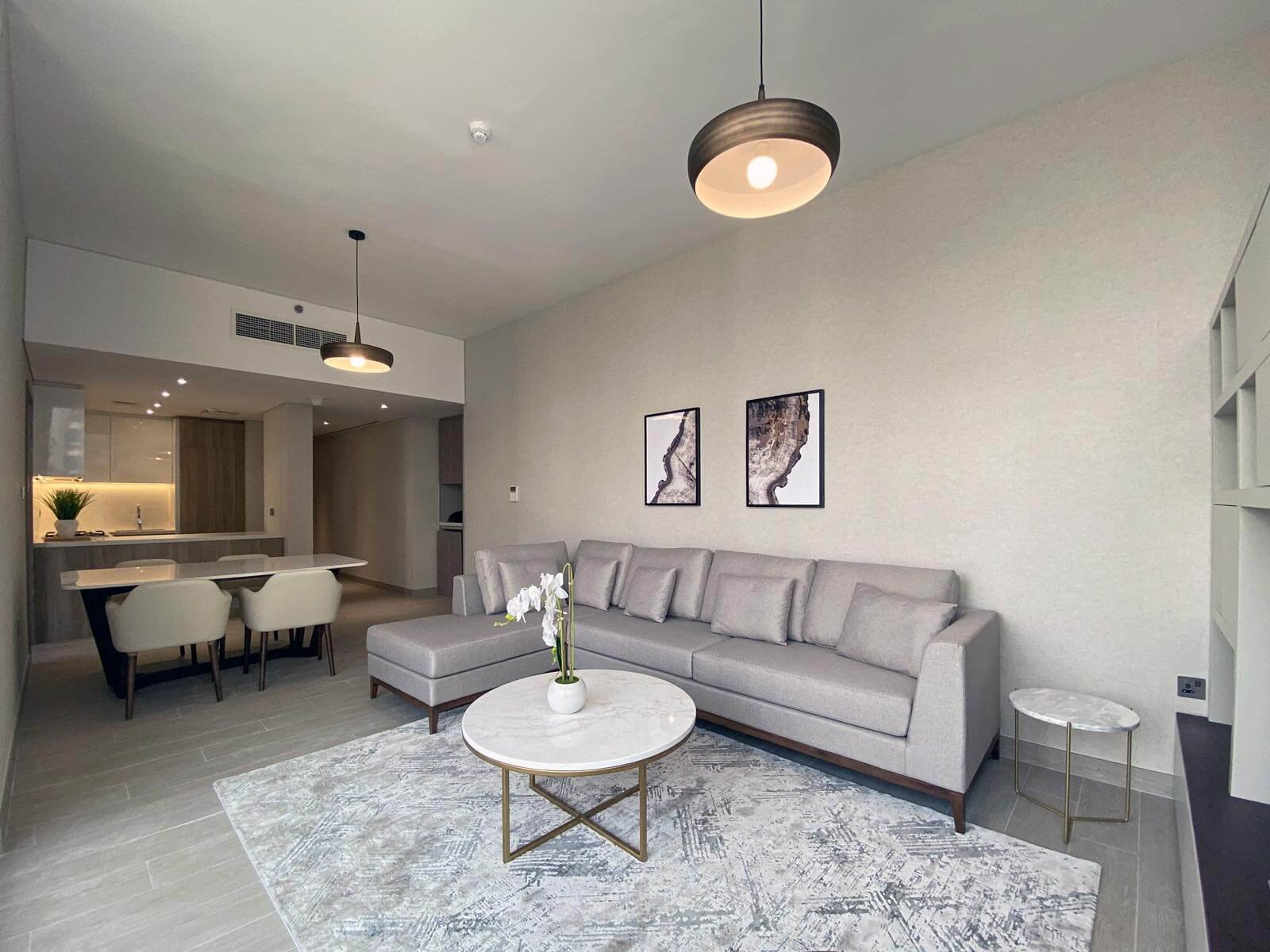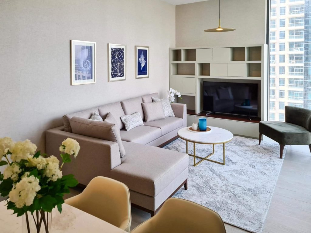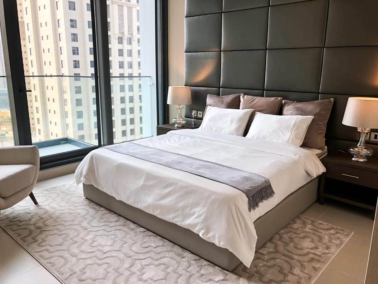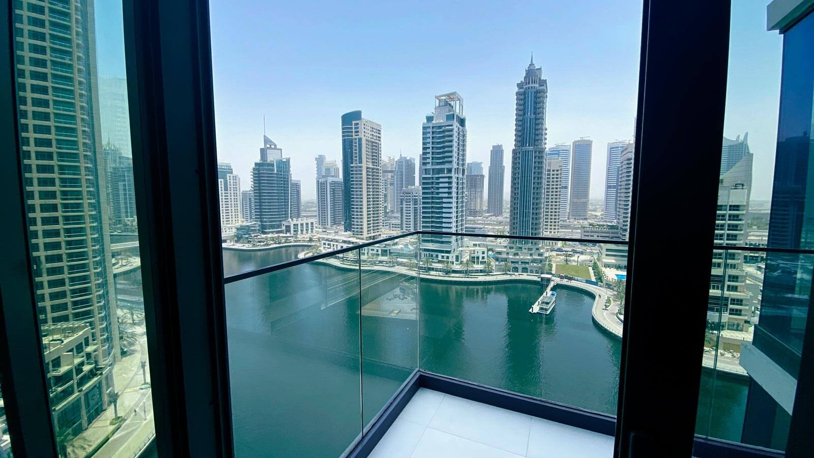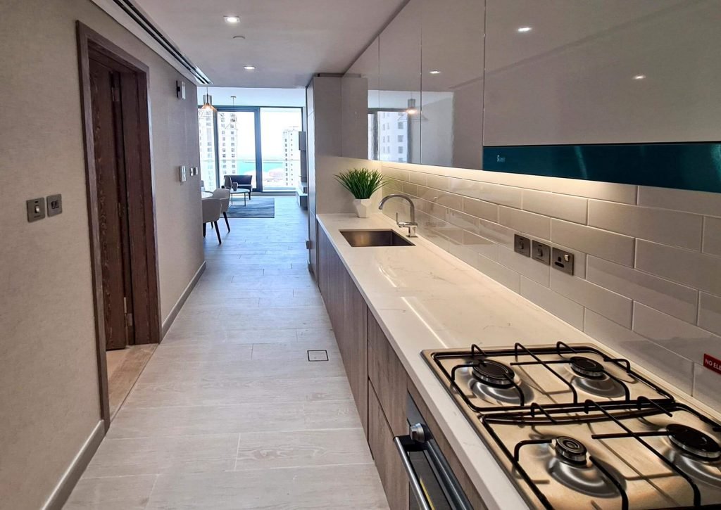 This luxurious apartment boasts a spacious open floor plan with a fully equipped kitchen, two double bedrooms with en-suite bathrooms, and two balconies with spectacular views from every room. It is tastefully decorated with warm lighting, providing a comfortable and elegant atmosphere for residents to enjoy. The building is conveniently located less than a kilometer from Marina beach and within walking distance of JBR. The development features a grand lobby with high ceilings and ambient lighting, creating a unique and upscale living experience for its residents.