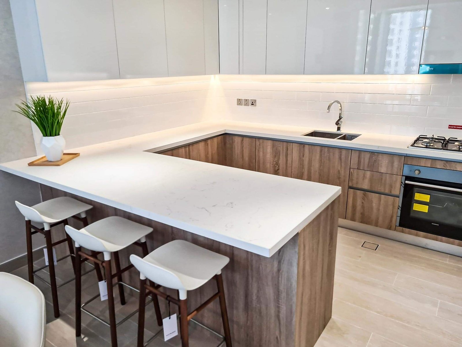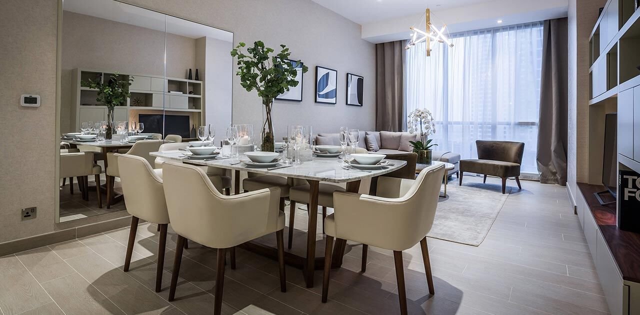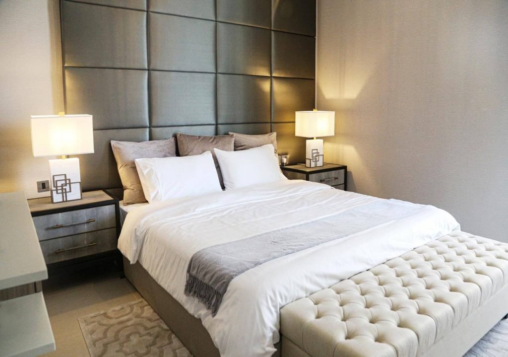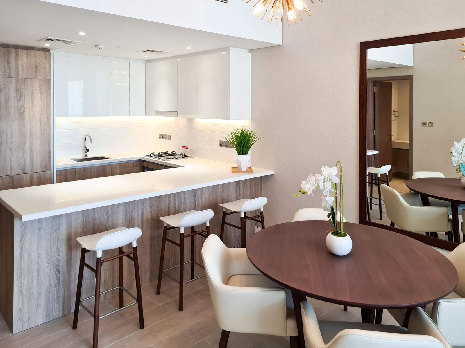 This luxurious apartment boasts a spacious open floor plan with a fully equipped kitchen, two double bedrooms with en-suite bathrooms, and two balconies with spectacular views from every room. It is tastefully decorated with warm lighting, providing a comfortable and elegant atmosphere for residents to enjoy. The building is conveniently located less than a kilometer from Marina beach and within walking distance of JBR. The development features a grand lobby with high ceilings and ambient lighting, creating a unique and upscale living experience for its residents.